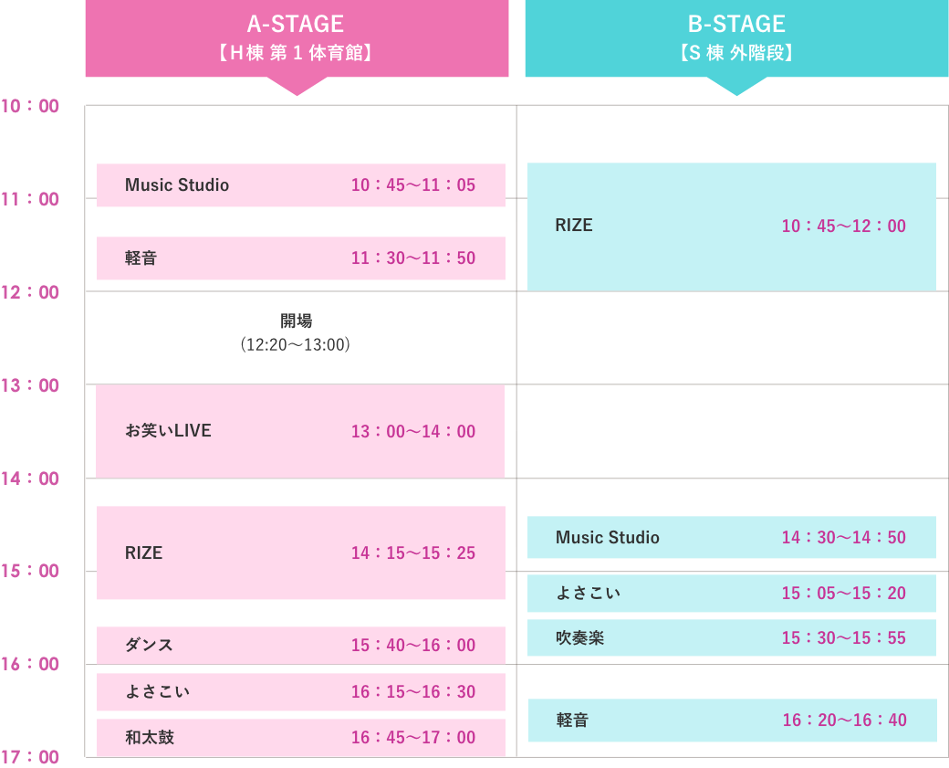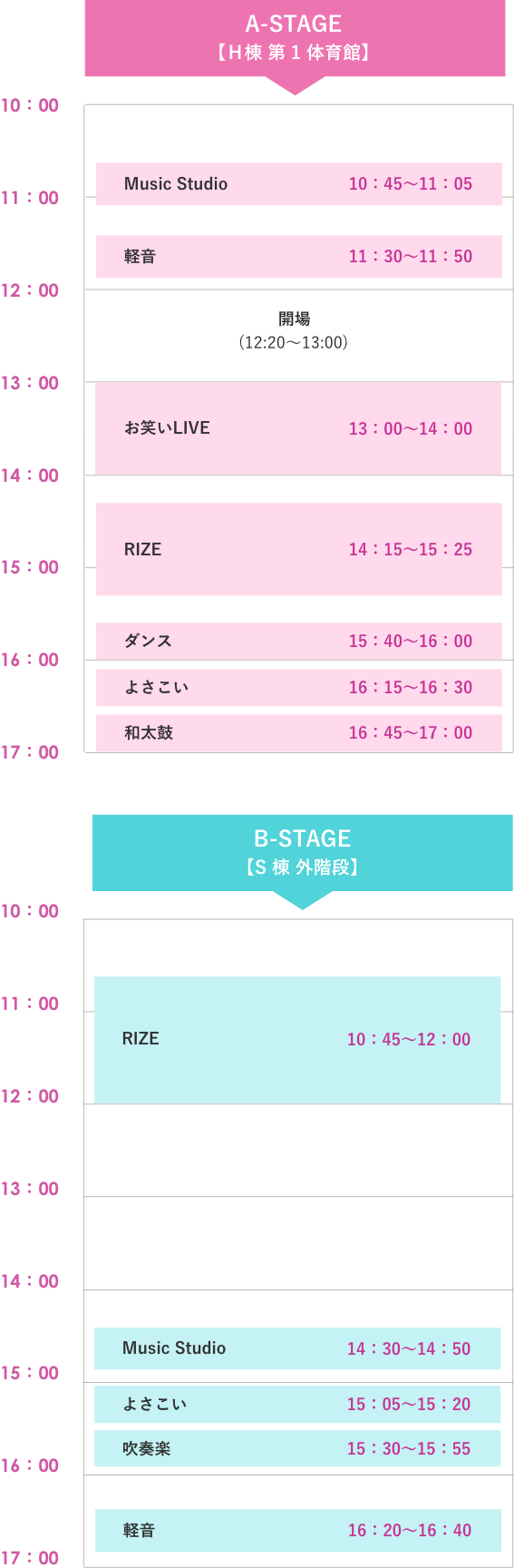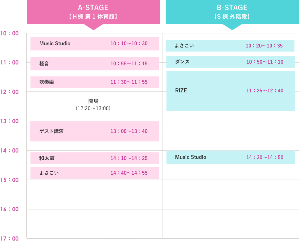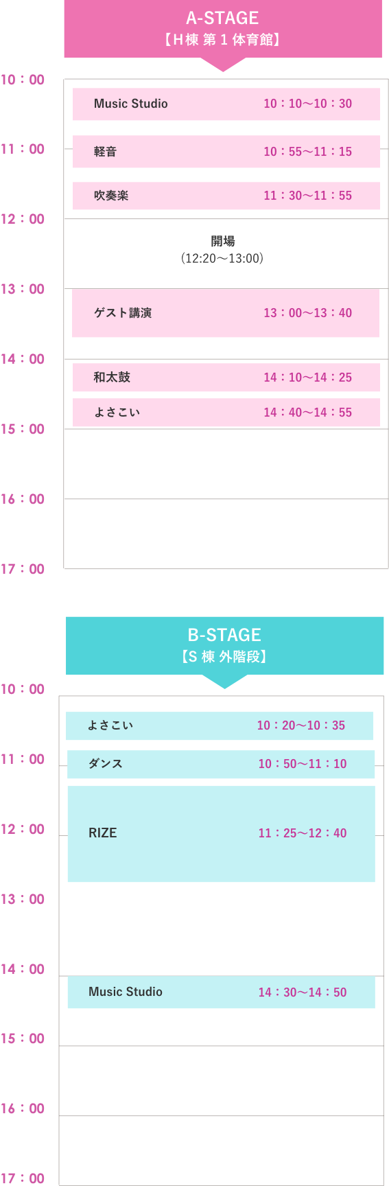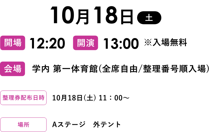 みなさんこんにちは!ステージ担当長の守屋です! ステージでは、ゲスト公演やクラブ・サークルの皆さんによる「見なきゃ損!」な発表が盛りだくさんになっています! 間違いなく、当日いちばんアツく盛り上がる場所です!! クラブ・サークルの皆さんが奏でる最高の音やパフォーマンスで、来てくれたみんなの心をぐっと結びつけられるように、私たち実行委員も全力でサポートしますのでぜひ皆さん遊びに来てください!